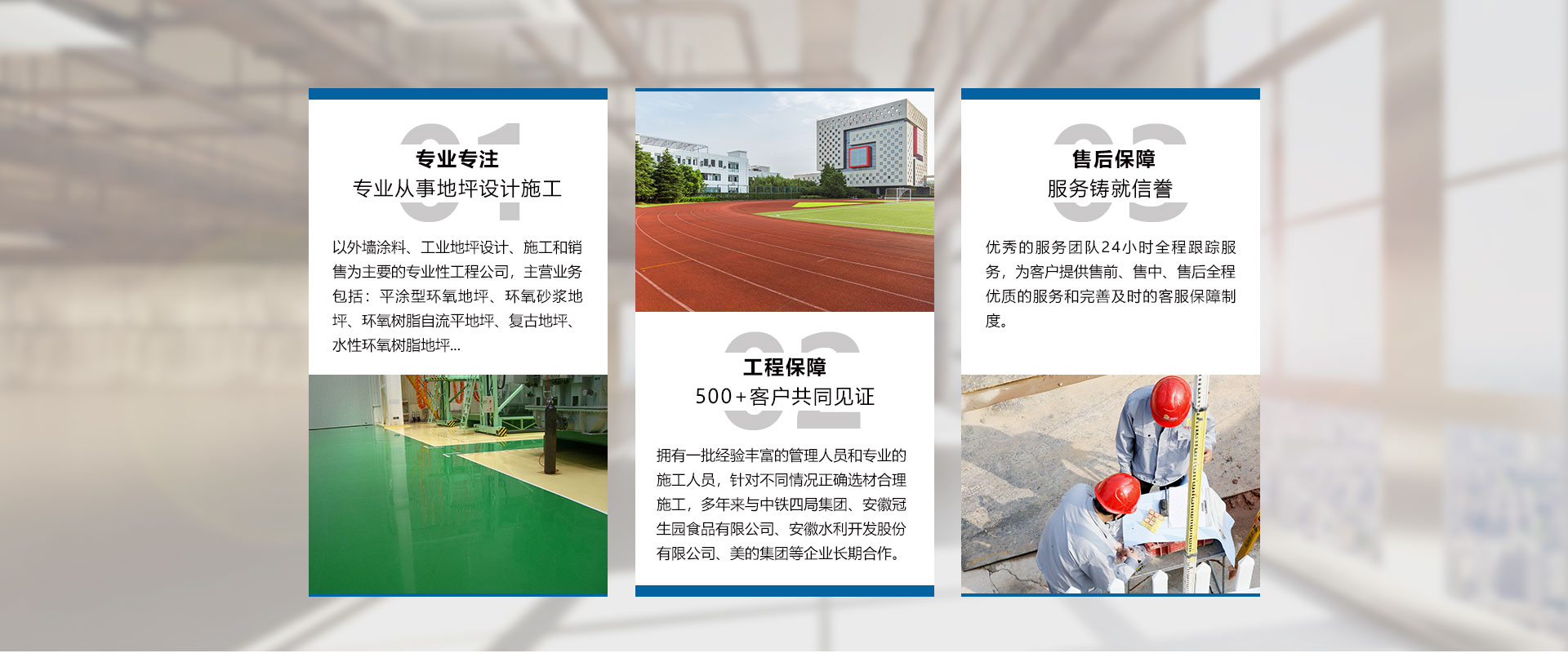 安徽世博裝飾工程有限公司成立于2009年,是一家以外墻涂料、工業地坪設計、施工和銷售為主要的專業性工程公司、是工業地坪施工的專業企業。公司設立了售后服務中心,用戶遍布全國大中小城市,一大批具有標志性的長期合作伙伴。“世博公司”環氧地坪工程,受到了越來越多的不同行業用戶的好評及青睞。公司擁有一批經驗豐富的管理人員和專業的施工人員,以保障產品的成功應用,用較小的代價獲得理想的效果,尤其在地坪涂裝方面優勢突出。而且以好的品質管理模式,向客戶提供“獨具魅力”、“性能優異”、“質量穩定”的產品。公司主要產品包括:平涂型環氧地坪、環氧砂漿地坪、環氧樹脂自流平地坪、滾涂型防靜電地坪、自流平防靜電地坪、復古地坪、水性環氧樹脂地坪、彩色透水混凝土地坪、壓花壓模藝術地坪、金剛砂耐磨硬化地坪、混凝土密封固化劑地坪、乙烯基酯重防腐地坪、GEP 標準型地坪、彈性PU運動場地坪、塑膠跑道地坪,PVC橡膠地板、停車場地坪、無震...